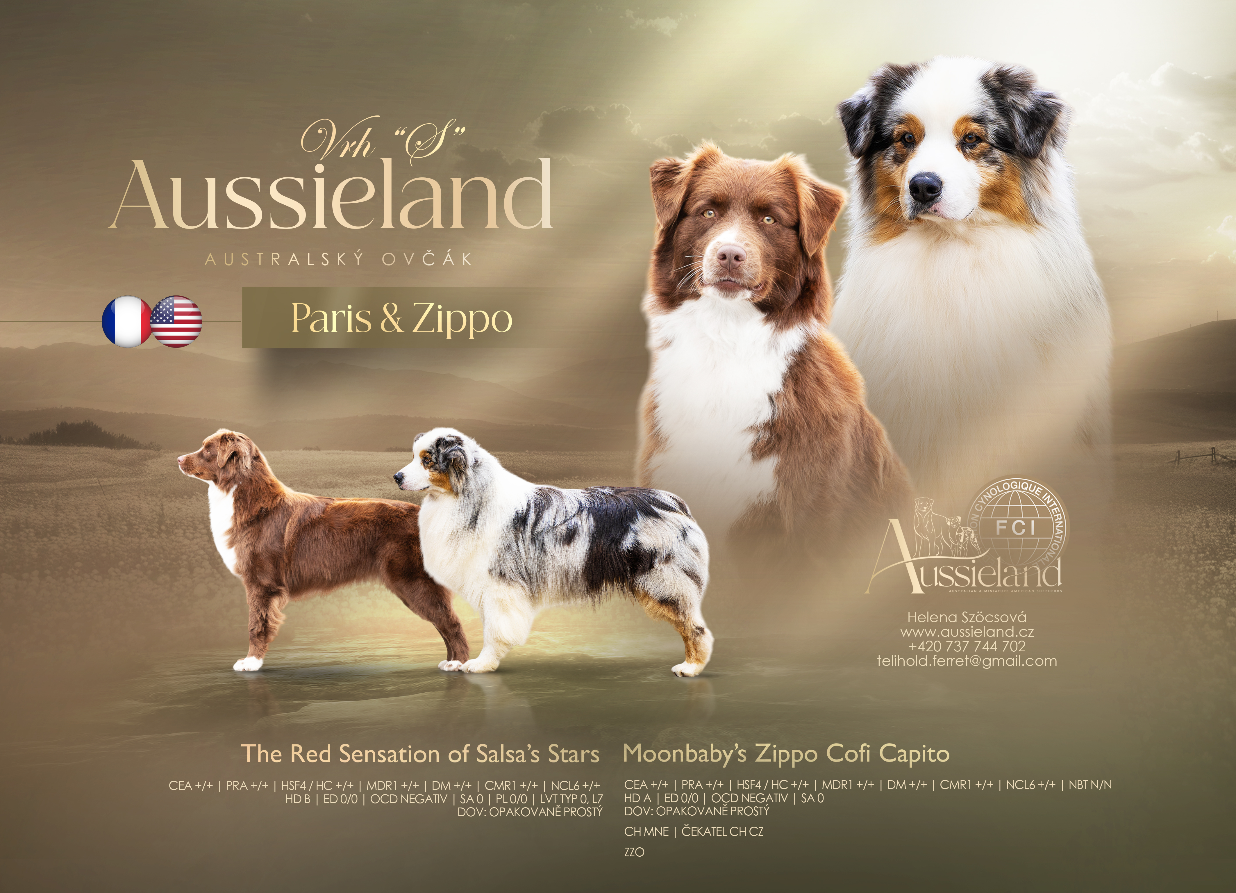Z tohoto spojení očekáváme štěňátka s pěkným exteriérem, korektní stavbou těla a především stabilní, sebevědomou a přátelskou povahou s přirozenou chutí ke spolupráci s člověkem. Naším cílem jsou jedinci, kteří budou vyrovnaní, dobře čitelní a přizpůsobiví jak aktivnímu životnímu stylu, tak běžnému rodinnému prostředí. Stejně důležitá je pro nás i zdravotní stránka. Oba rodiče mají skvělé zdravotní výsledky a čisté genetické testy.