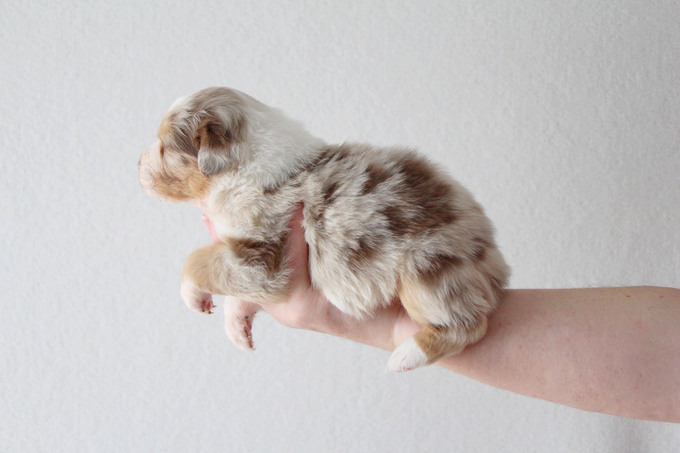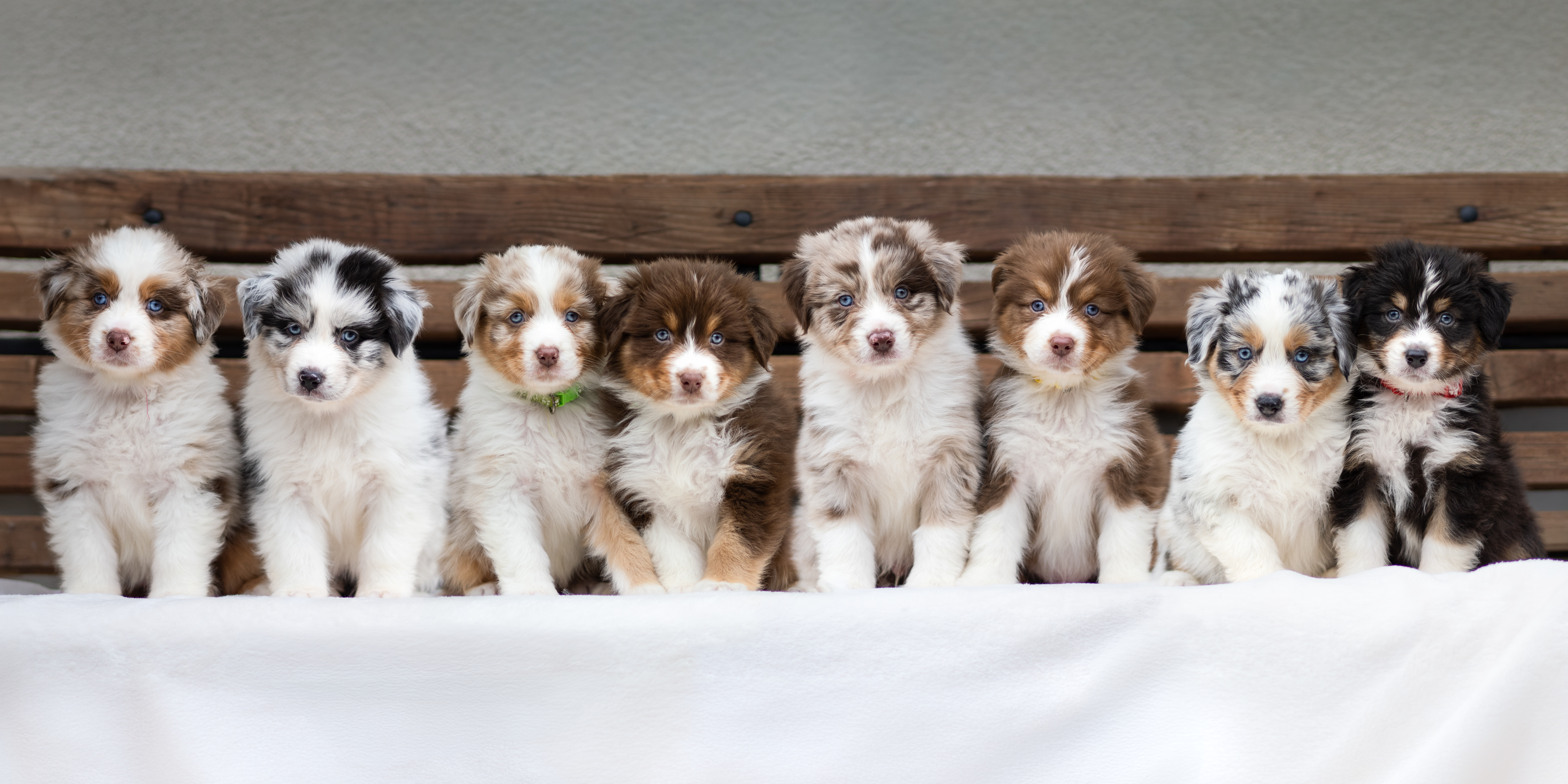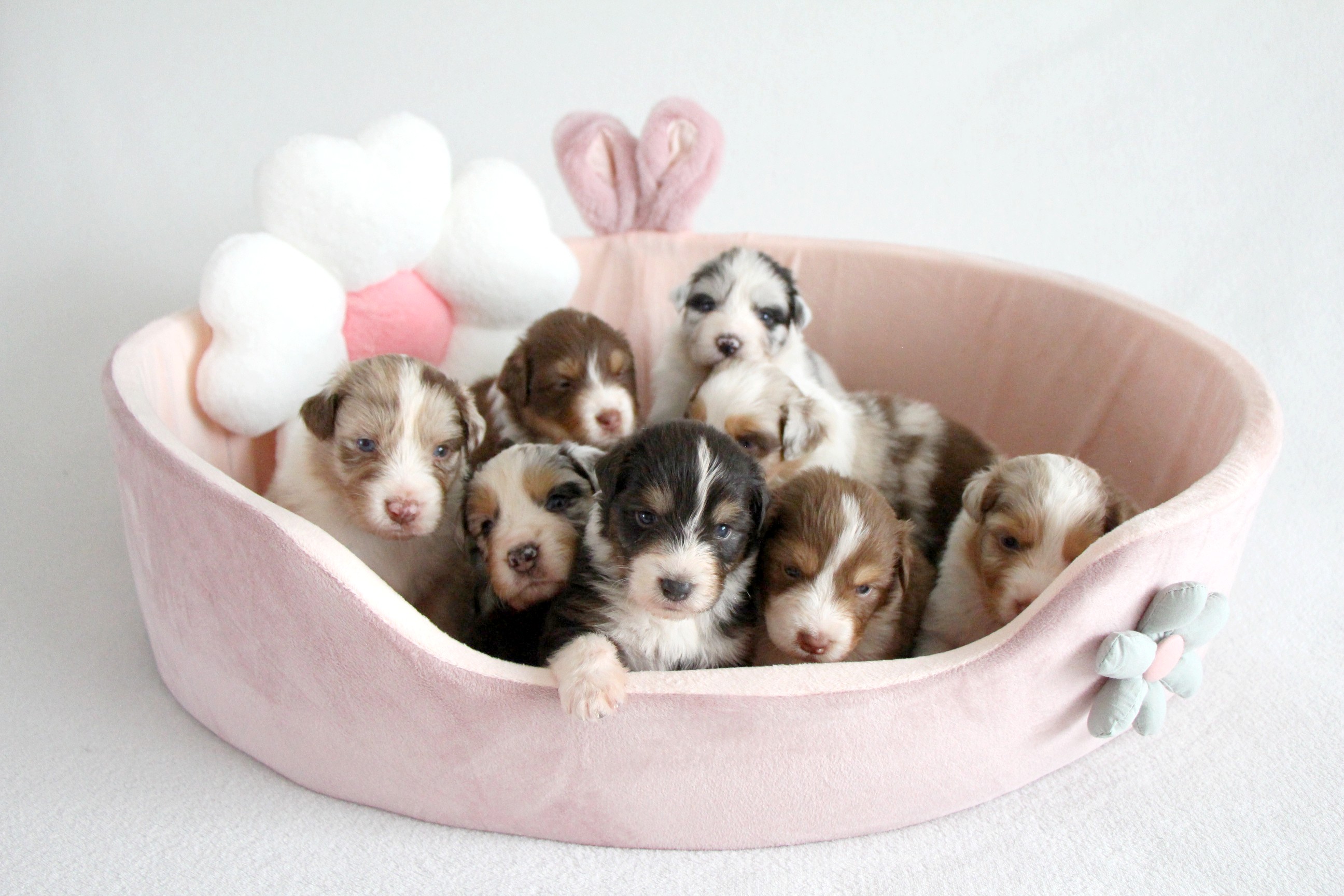 Máme 8 štěňátek (6 pejsků a 2 fenečky). V barvách black tri, red tri, blue merle, red merle - tri a bi.